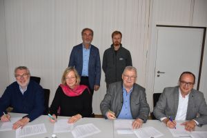 Bürgermeisterin Dr. Dr. Kristina Becker, Landrat Manuel Westphal, OB Jürgen Schröppel und LPV-Sprecher Gerhard Wägemann setzten ihre Unterschriften unter die Trägervereinbarung.